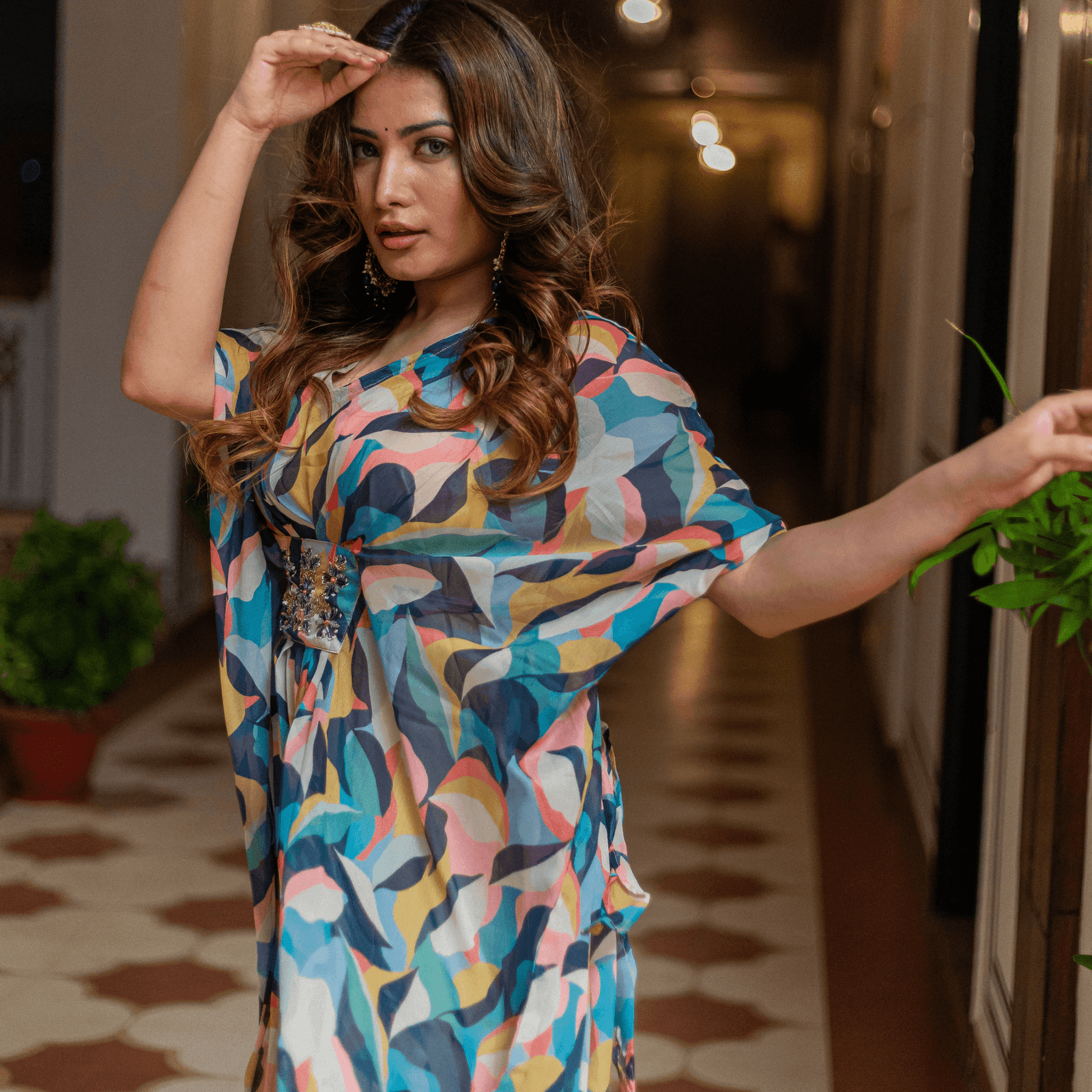 Imagine yourself draped in this luxurious fabric, each shade intertwining to form a masterpiece of elegance and allure. With its flowing silhouette and vibrant palette, this kaftan whispers tales of exotic destinations and sun-kissed adventures. Elevate your wardrobe to new heights and captivate every eye with the allure of this enchanting garment. Embrace the artistry of color and let your presence radiate in every room, for this isn't just a kaftan. it's a statement of sophistication and glamour.