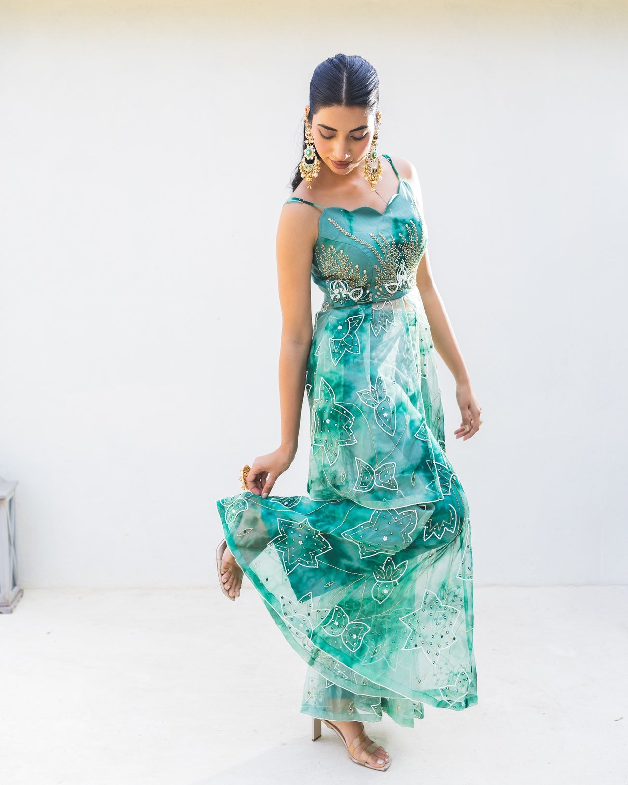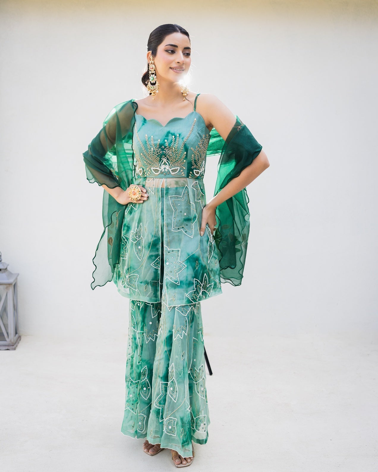 Embrace a modern, playful aesthetic with the stunning Ocean Green Tie-Dye Sharara Set. This eye-catching ensemble features a short, contemporary kurti crafted in shades of mint and emerald green with an artistic tie-dye and subtle floral print. The kurti has a flattering, fitted bustier top and is exquisitely detailed with gold and white threadwork and bead embellishments, adding sparkle and dimension.