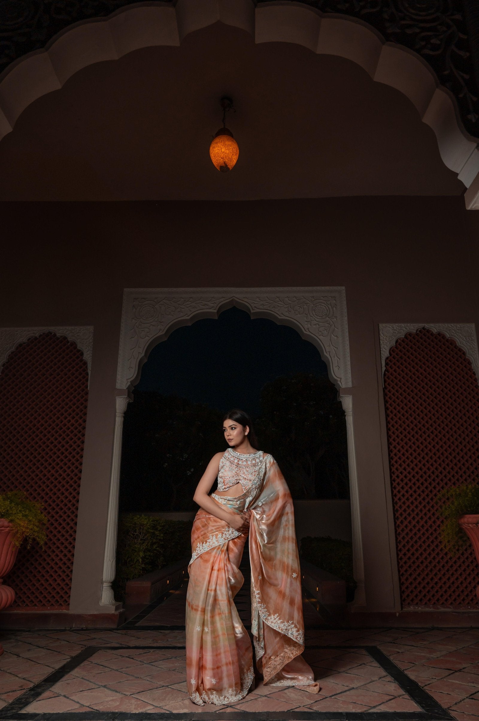 Add a touch of grace to your wardrobe with the Subhraya Peach Pink Tissue Silk Saree, perfect for weddings, festive events, and special occasions. This exquisite saree is crafted from luxurious tissue silk, offering a soft sheen and a flowing drape. The delicate peach pink color enhances the saree’s charm, making it an ideal choice for daytime celebrations and elegant evening affairs. Designed to elevate your style, this saree combines timeless tradition with modern elegance.